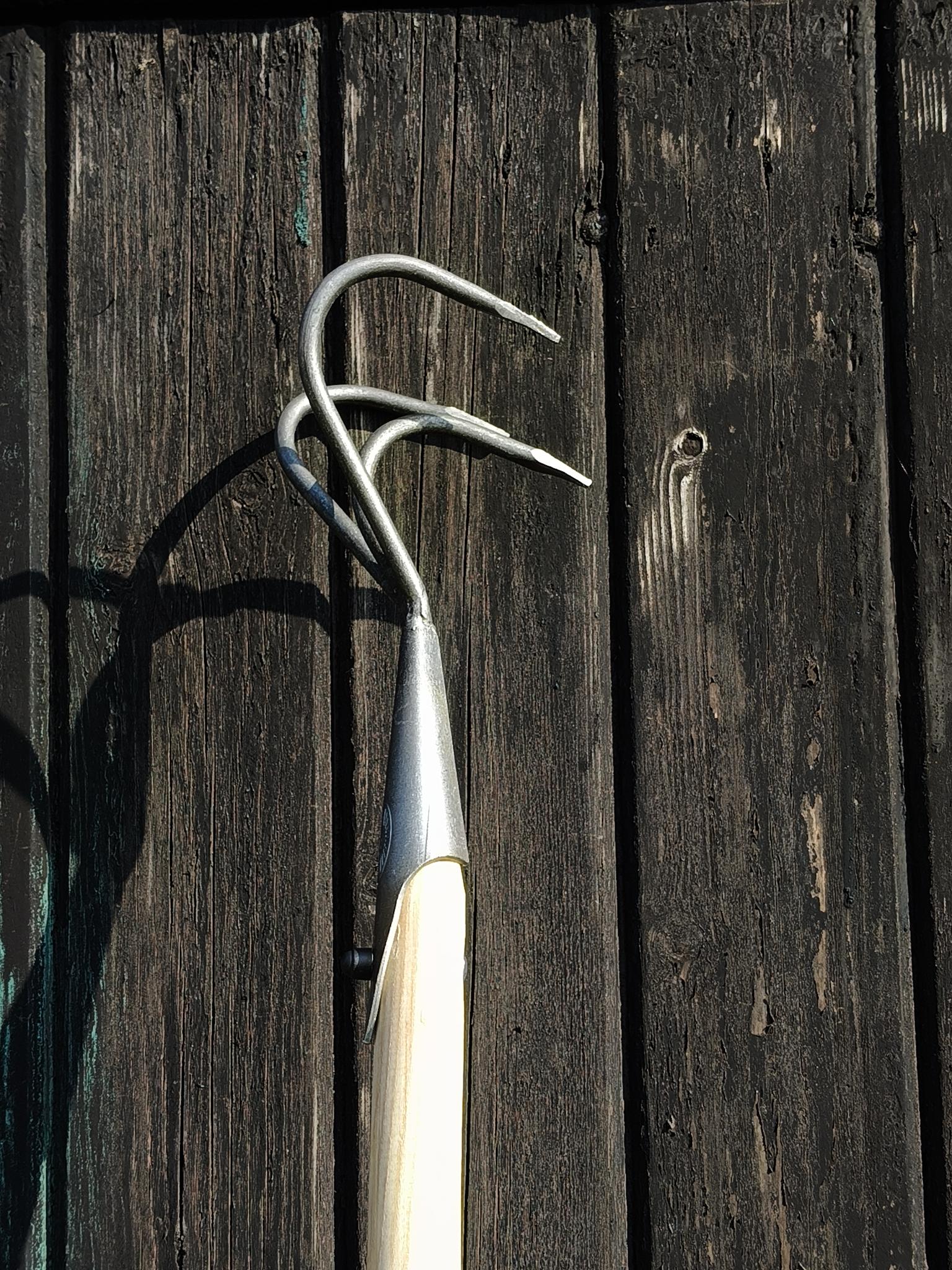 Gebruik: de punten in de grond zetten en de cultivator naar je toe trekken of licht heen‑en‑weer bewegen; de knop aan het uiteinde geeft extra grip en controle, en vermindert belasting van rug en schouders.