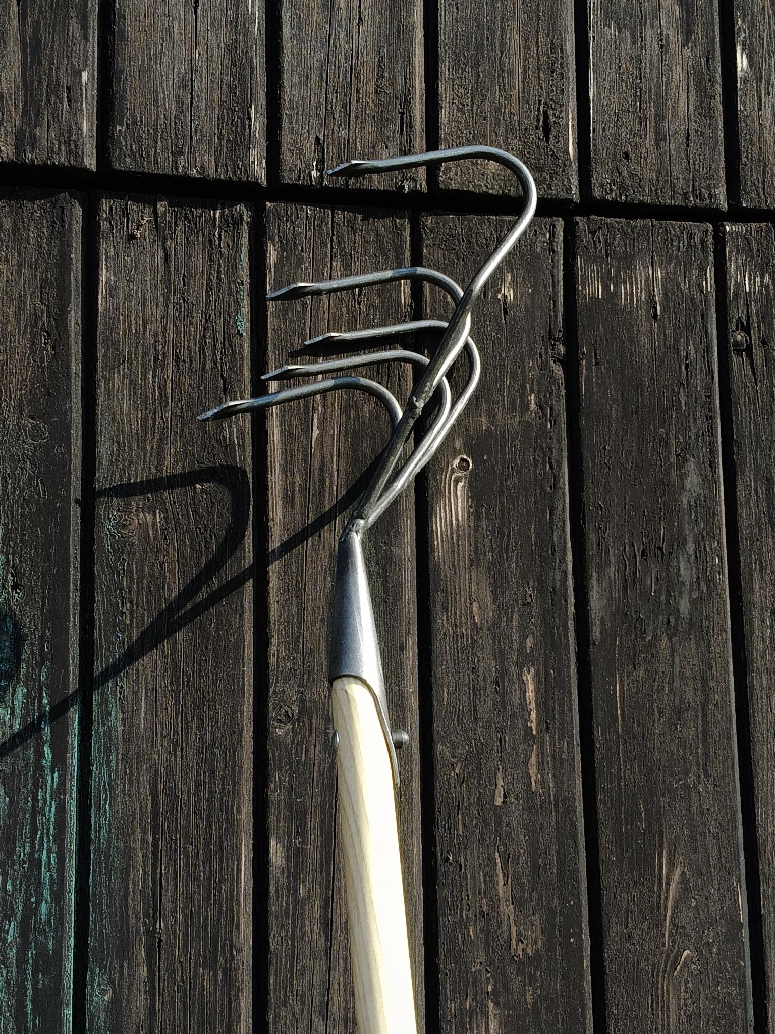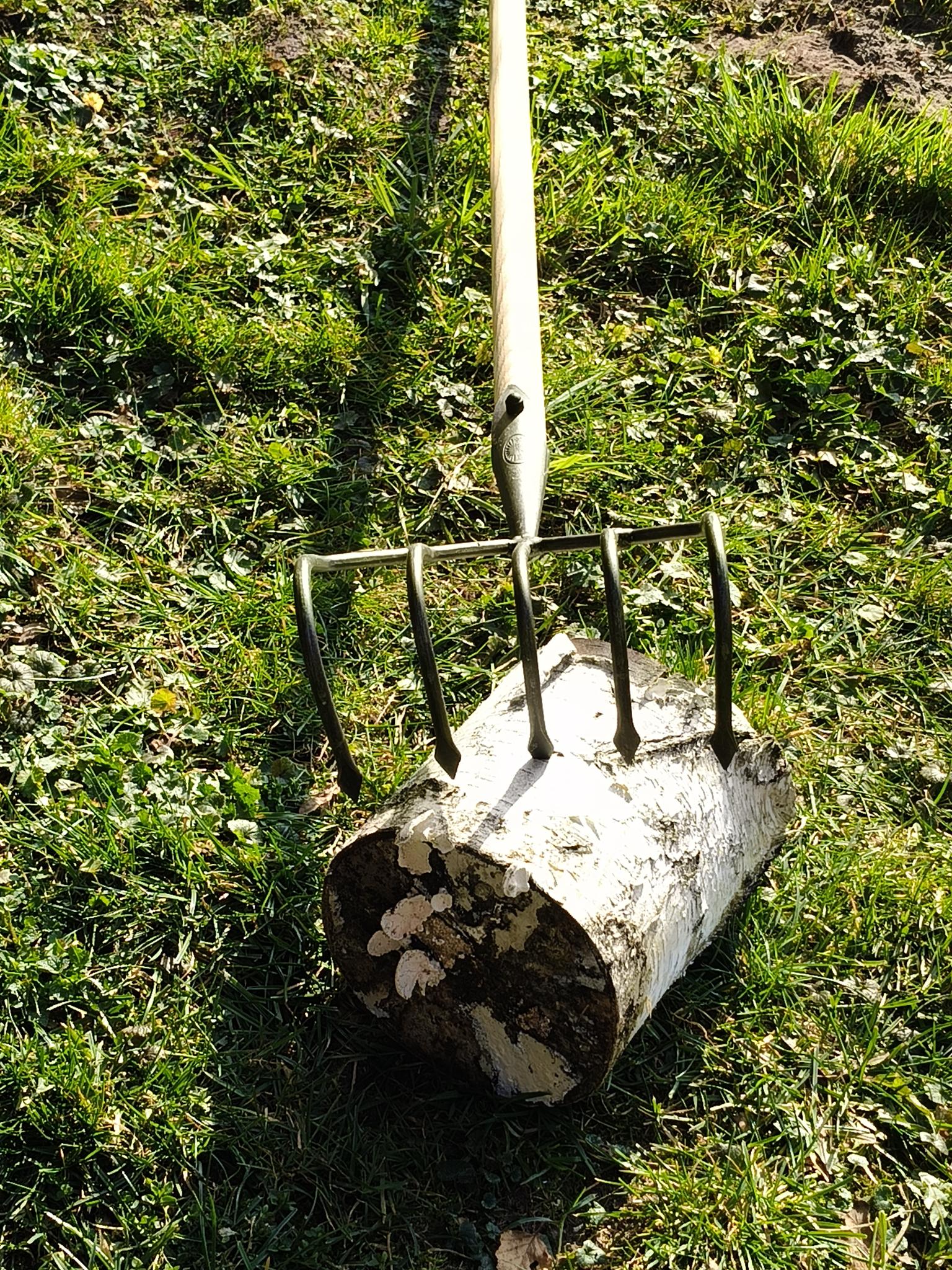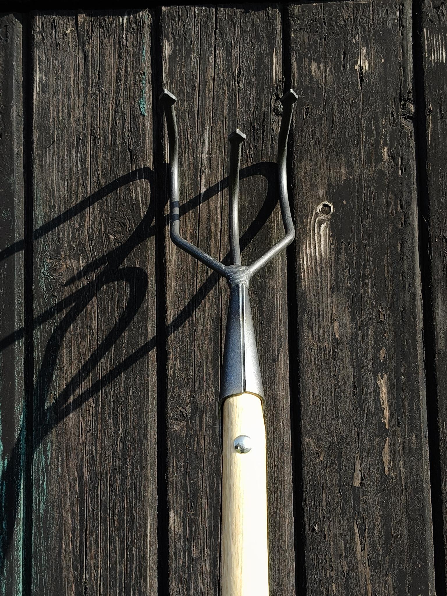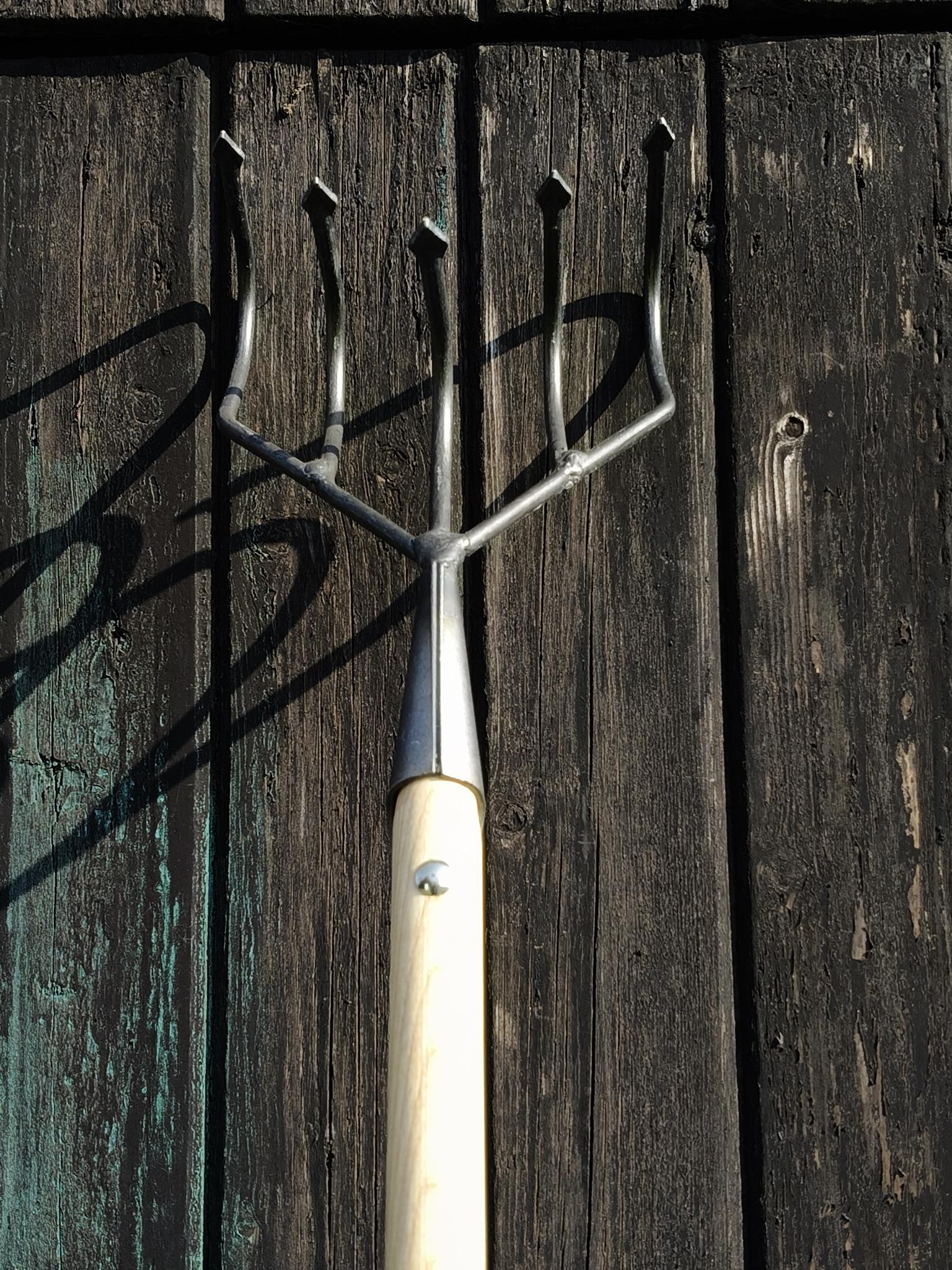 Een cultivator (tuinwoeler) met 3 of 5 gesmede tanden en een essen houten knopsteel van 155 cm is een robuust handgereedschap om de bodem diep los te maken, te beluchten en onkruid met wortel te verwijderen tussen gewassen, in borders en in de moestuin.