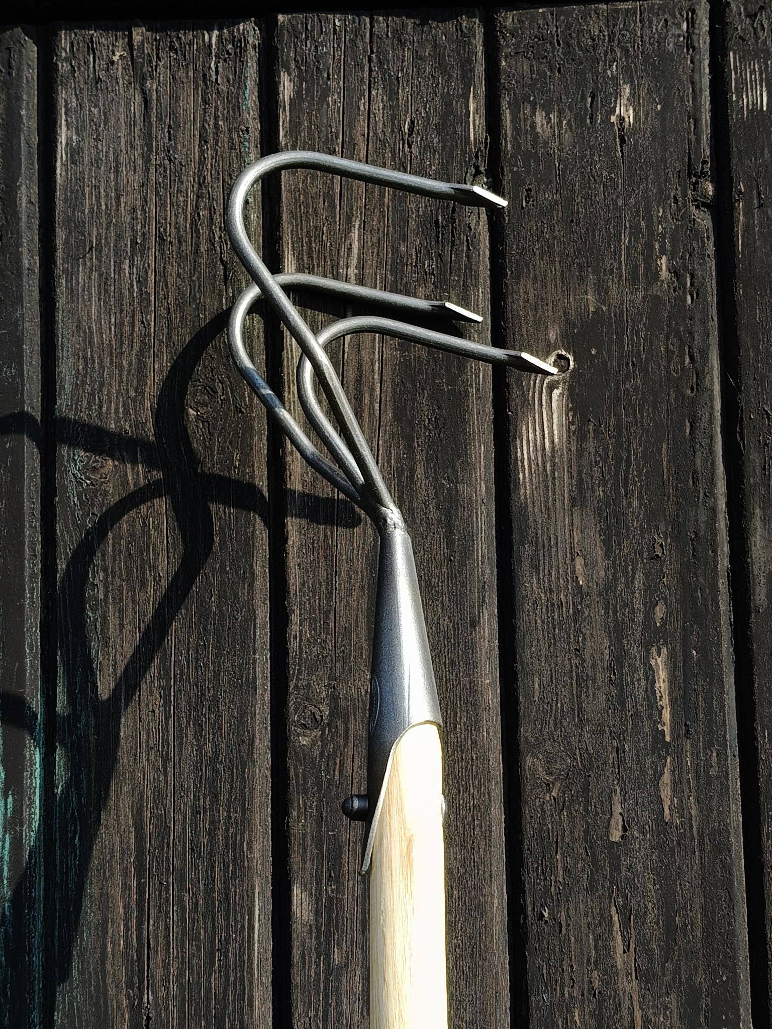 Gebruik: met de tanden in de grond zetten en de woeler naar je toe trekken of licht heen-en-weer bewegen; de lange steel en knop geven veel controle en verminderen belasting van rug en schouders.