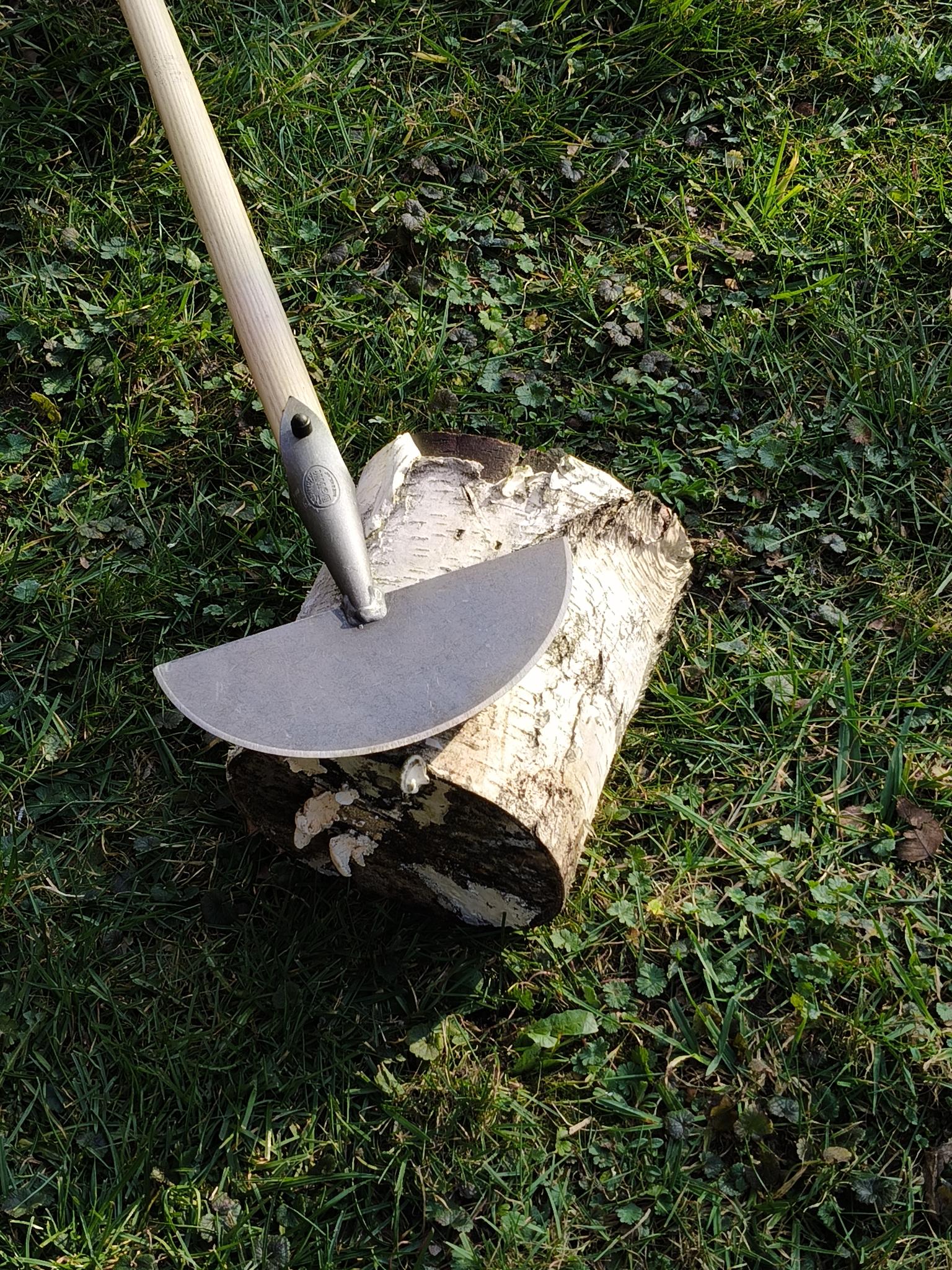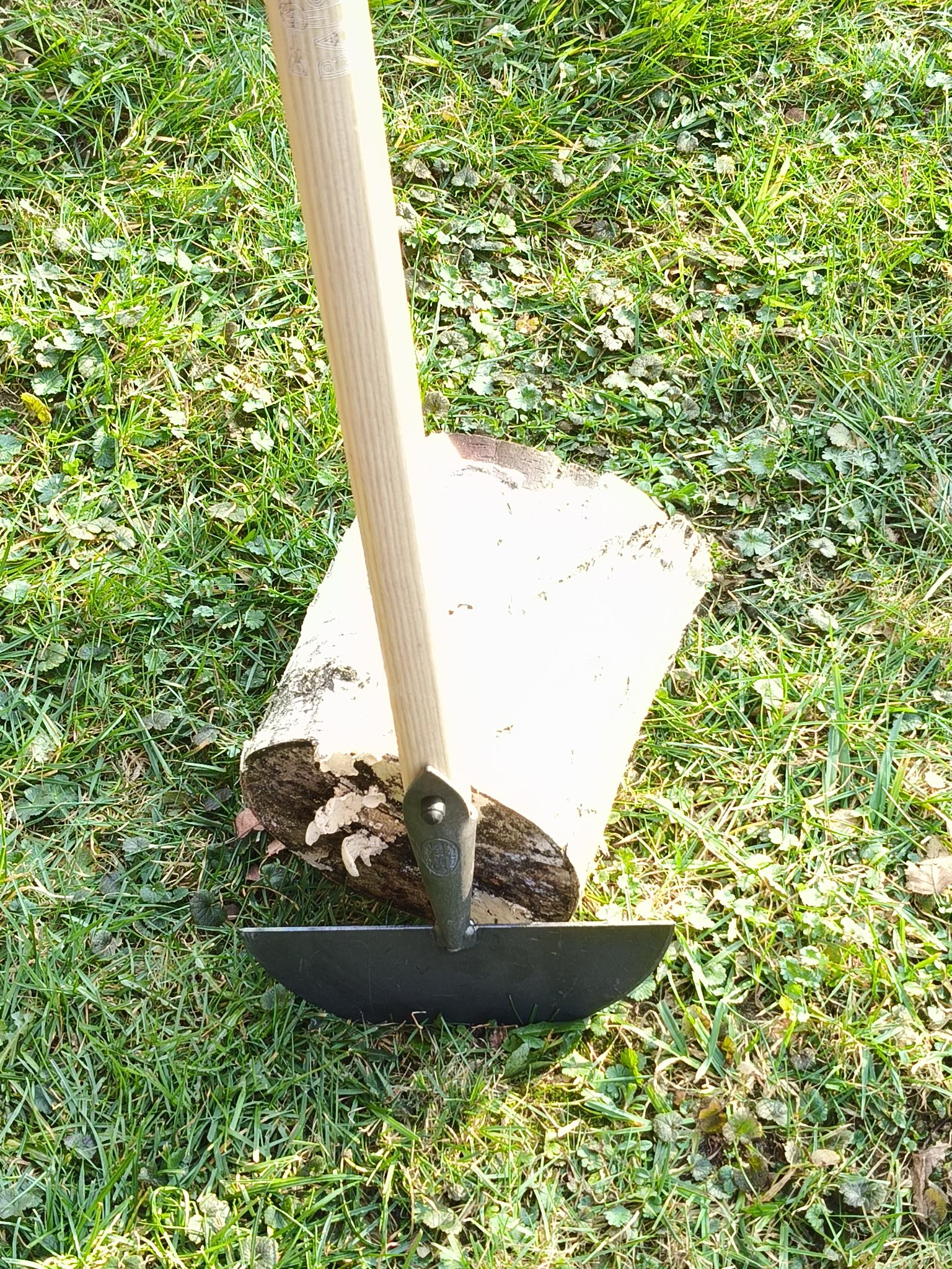 Gesmeed stalen blad van ca. 21–24 cm breed en 3 cm dik, volledig scherpgeschuurd rondom voor moeiteloos snijden door graszoden, zelfs in zware of natte grond.