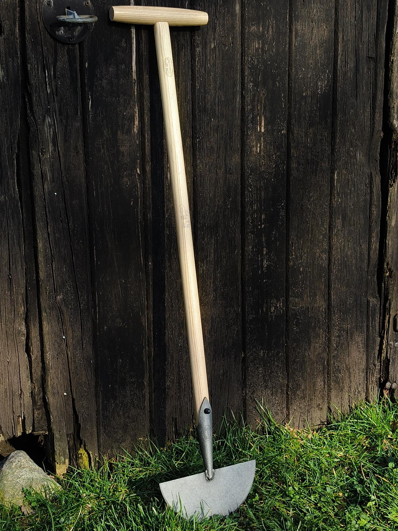 Een graskantsteker met essen houten T-steel van 85 cm is een licht en scherp tuingereedschap om grasranden langs borders, paden of terrassen netjes af te steken, met een ergonomische greep voor precies werk zonder veel inspanning.